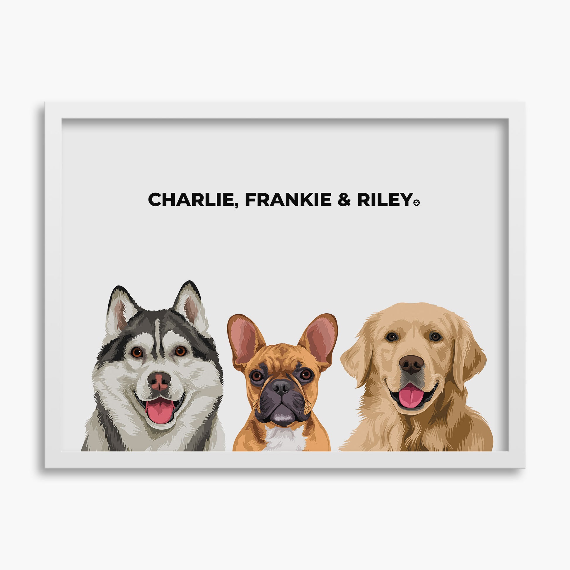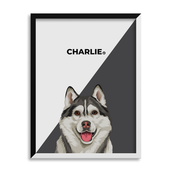 Choose from various portrait sizes, background colors, frame styles, and add your fur baby’s name.